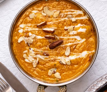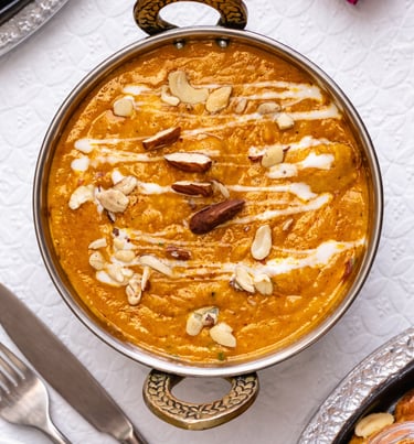 Creamy Indian butter chicken curry in a copper bowl garnished with cashews, almonds, and cream drizzle.
